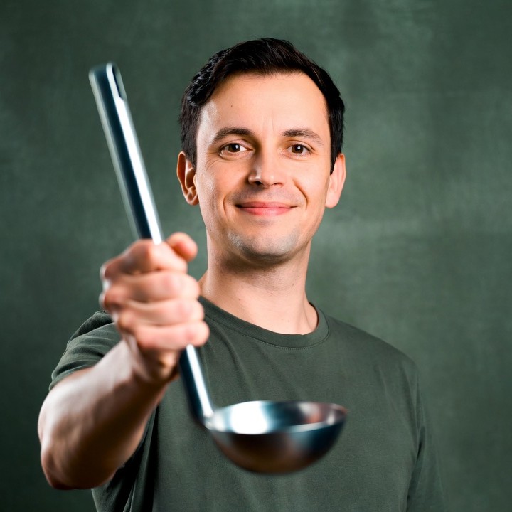 A smiling man with short dark hair holds up a large metal ladle with his right hand. He wears a green t-shirt and stands against a solid green background. His expression is friendly and engaging.