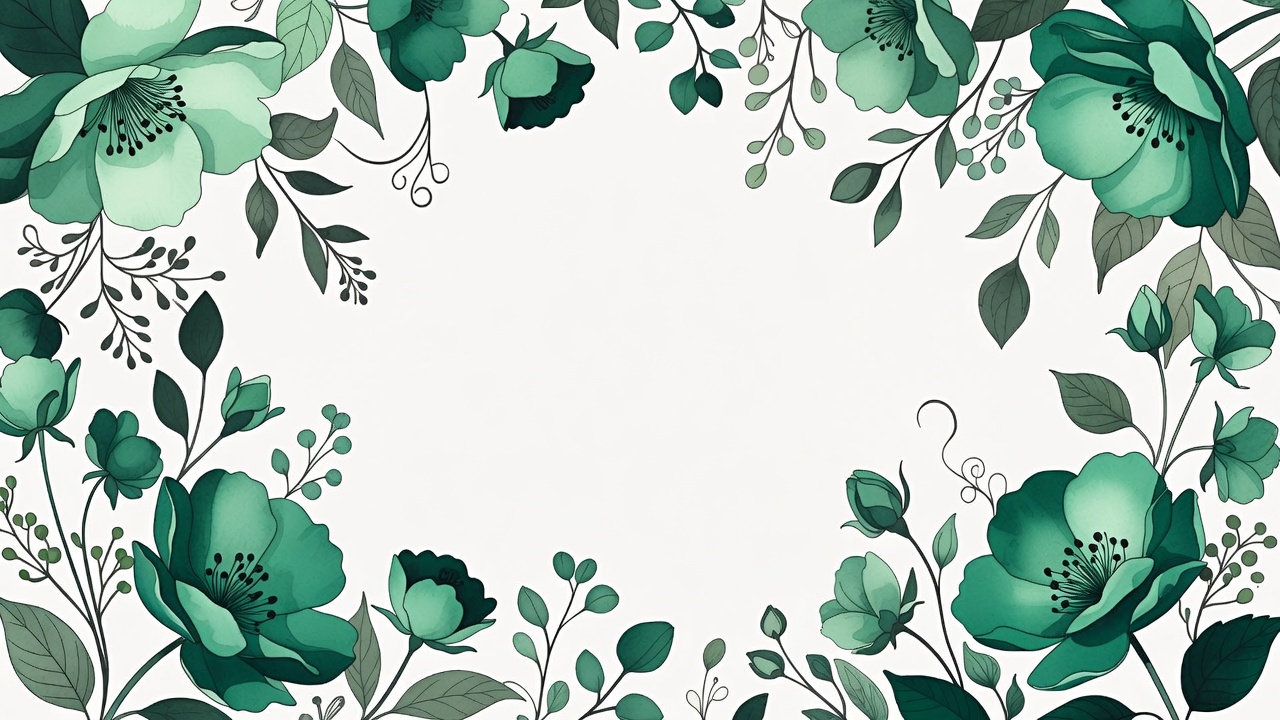 A vibrant digital illustration features lush green flowers and leaves arranged in an ornate frame. The design surrounds a large central white space, perfect for text or graphics. Delicate buds, stems, and petals create an elegant border in shades of emerald and lime green.