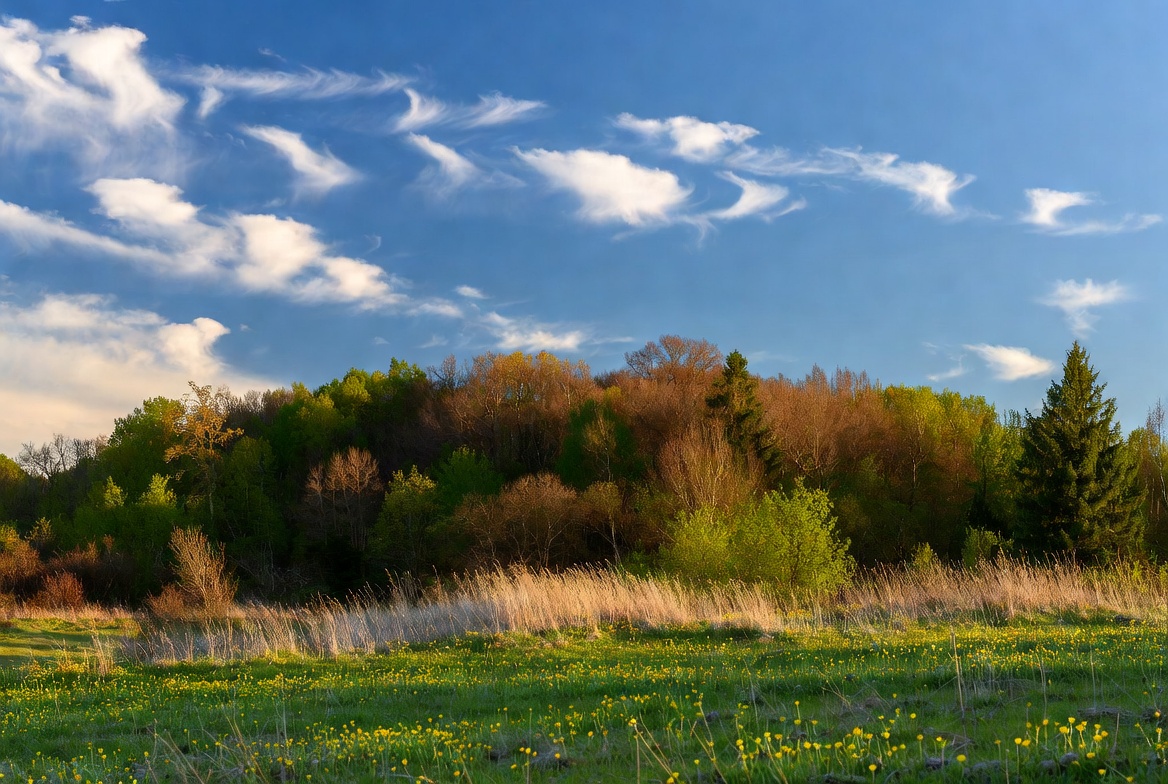 blue sky, cloudy sky, fall trees, foliage, grassy meadow, green field, hillside, landscape, meadow, natural landscape, nature, outdoors, scenery, tall grass, trees, vibrant colors, white clouds, woods, yellow flowers, autumn forest