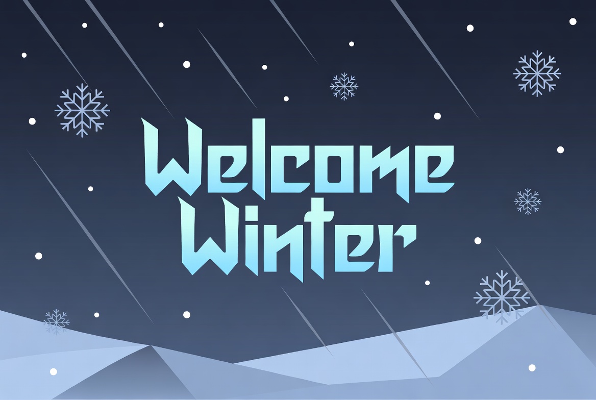 blue text, clipart, dark background, digital art, falling snow, festive winter, geometric design, icy landscape, night sky, polygonal art, snow background, snow flurry, snowflakes, snowy hills, welcome sign, winter graphic, winter greeting, winter illustration, winter text, welcome winter