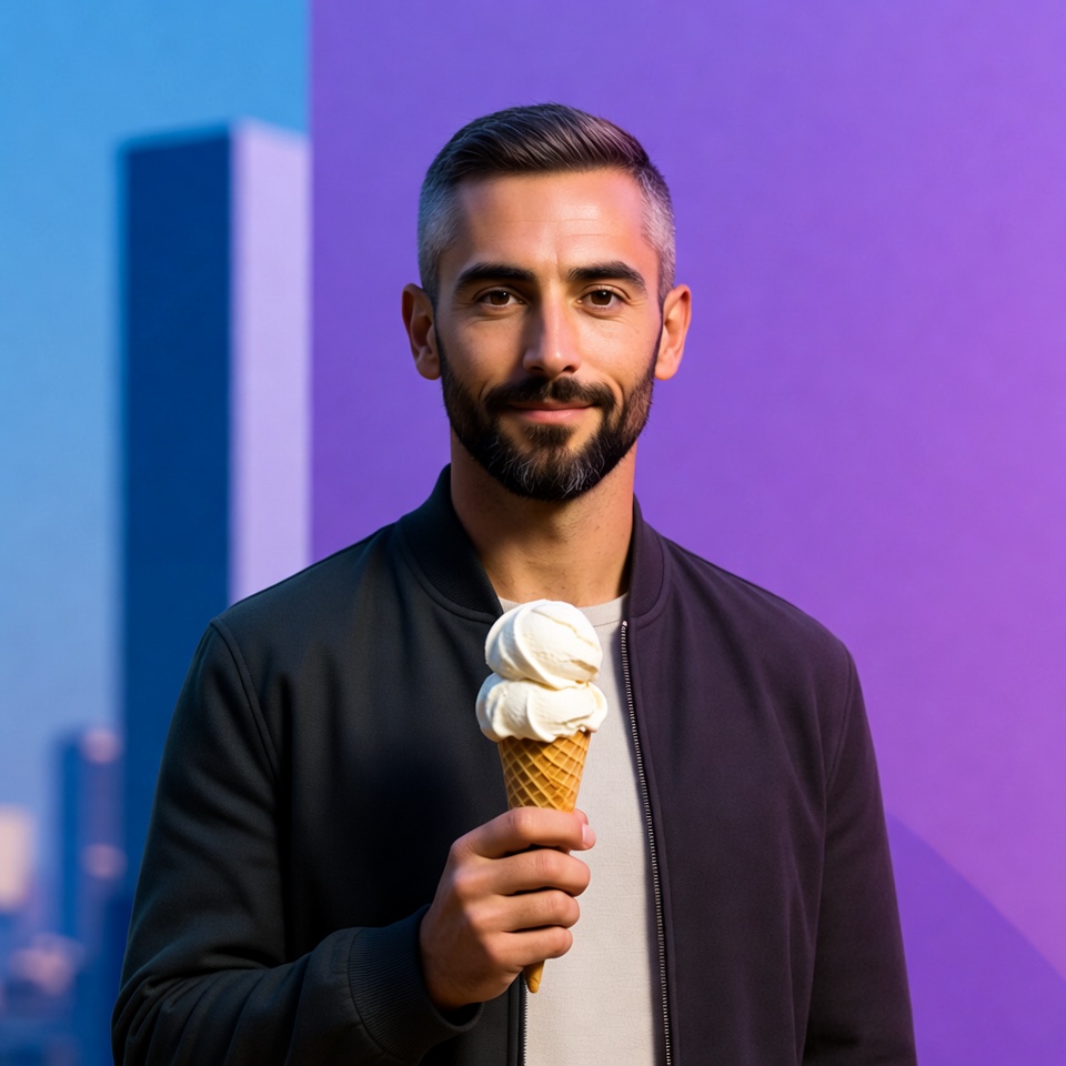 A man with short gray hair and a beard stands against a vibrant purple background, holding a waffle cone topped with soft white vanilla ice cream. He wears a black bomber jacket over a white shirt and faces the camera directly. Geometric purple panels and subtle city lights appear in the backdrop.