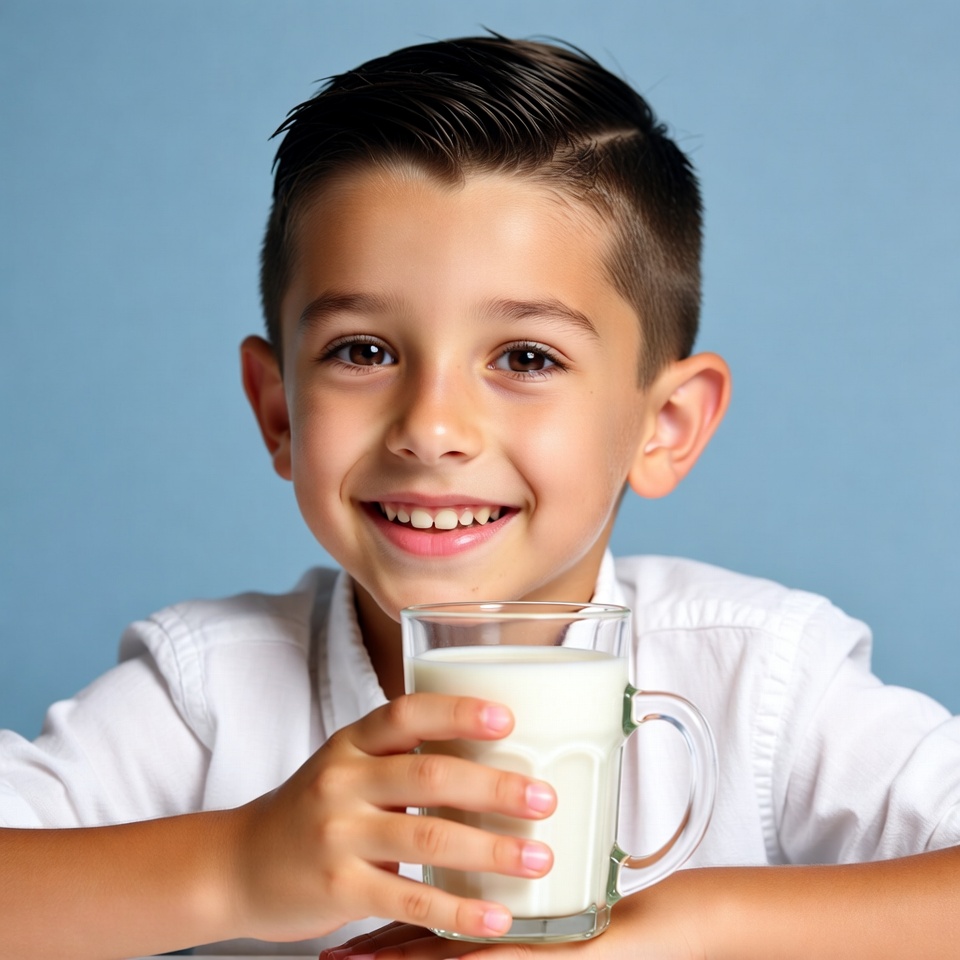 A young boy with short dark hair smiles happily while holding a clear glass of milk with both hands. He wears a white shirt and stands against a solid blue background. His eyes are bright and he shows his teeth in a cheerful grin.
