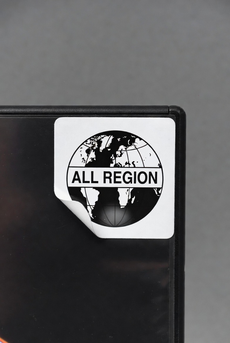 DVD case, DVD sticker, black white, circular sticker, compatibility label, globe, international DVD, peeling sticker, region free, video disc, world map, all region