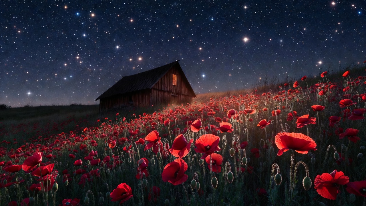 A wooden barn sits on a hillside covered in vibrant red poppy flowers. The scene is illuminated under a clear night sky filled with bright stars. The poppies gently sway, creating a sea of red against the dark landscape.
