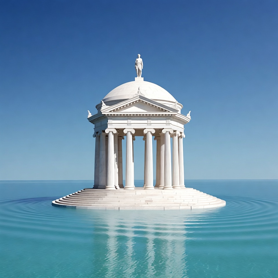 Greek temple, Roman temple, blue sky, classical architecture, columns, dome, floating temple, island, isolated background, male statue, marble temple, ocean, reflection, ripples, statue, steps, turquoise water, water, white marble, temple