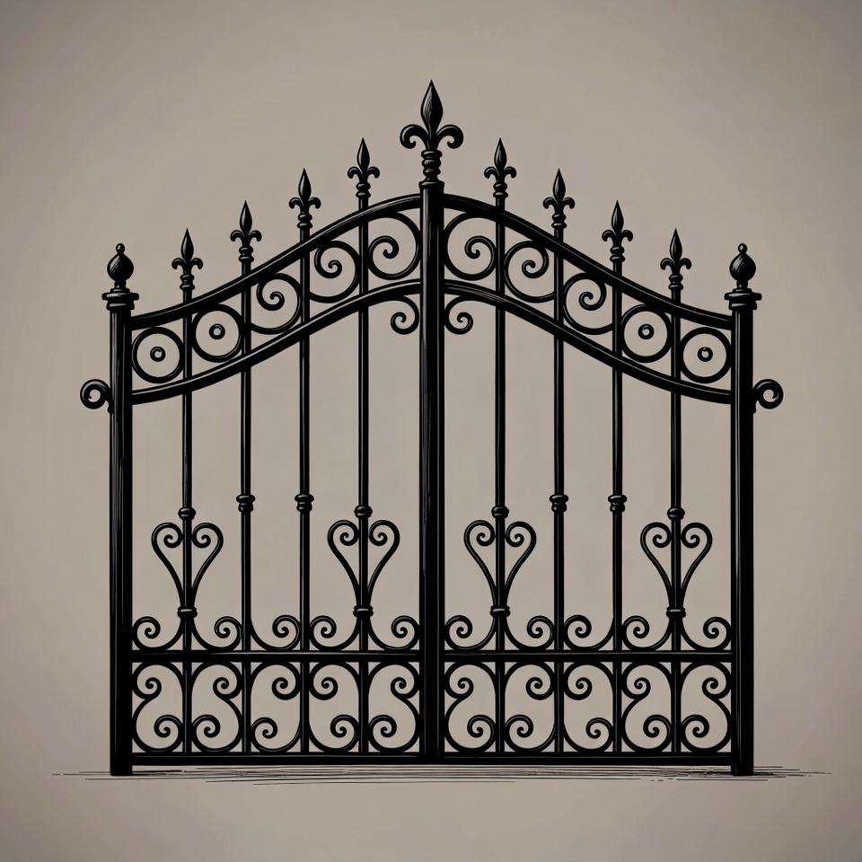 arched gate, black gate, clipart, closed gate, decorative gate, double gate, fence gate, finials, fleur-de-lis, gate illustration, gothic gate, heart motifs, isolated background, metal gate, ornate gate, scrollwork, vector art, vintage gate, wrought iron, iron gate