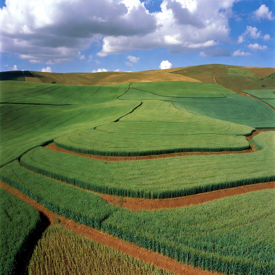 agriculture, blue sky, cloudy sky, crops, earthy ridges, farming, fields, golden fields, green fields, hills, landscape, lush greenery, paddy fields, rice paddies, rolling hills, rural, terraces, undulating terraces, vibrant green, terraced fields