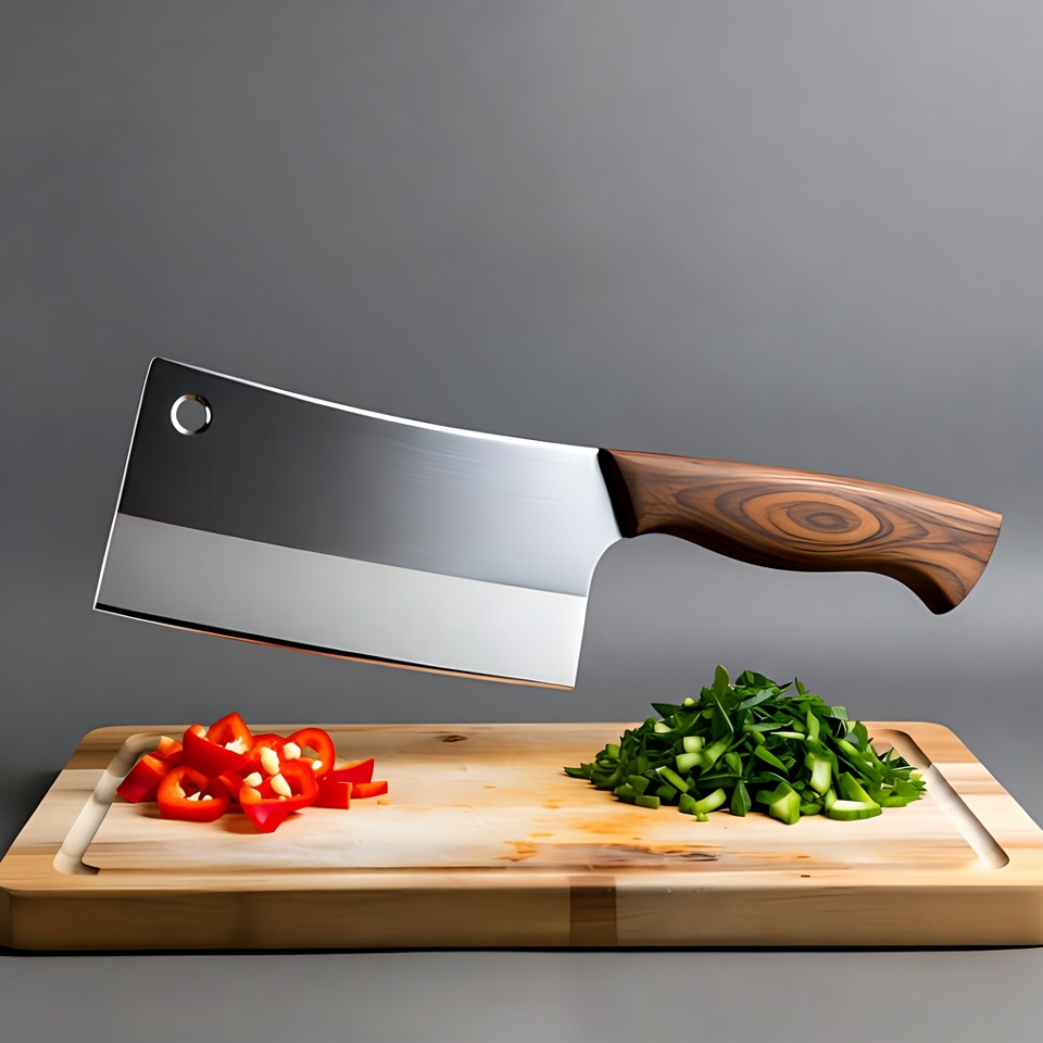 A large cleaver with a silver blade and brown handle hovers above a wooden cutting board. The board holds chopped red bell peppers and green herbs like scallions. The scene is set against a plain gray background.