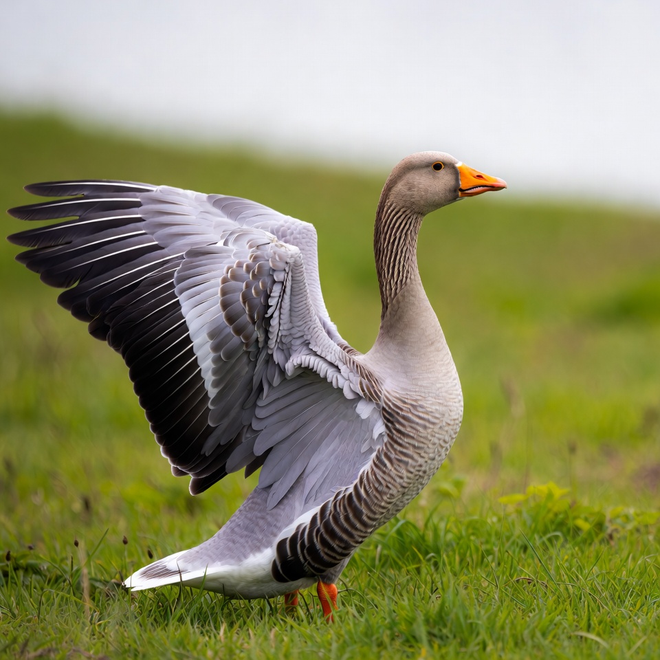 A greylag goose stands on green grass with its wings fully spread wide. The bird has a gray body with white and black wing feathers, an orange bill, and orange feet. A blurred green grassy background highlights the goose.