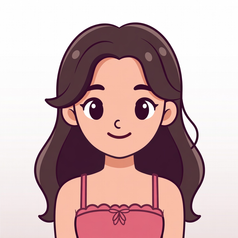 A cute anime-style illustration of a young woman with long wavy brown hair and large expressive eyes. She wears a pink camisole top with lace trim and a small bow. She smiles gently against a white isolated background.