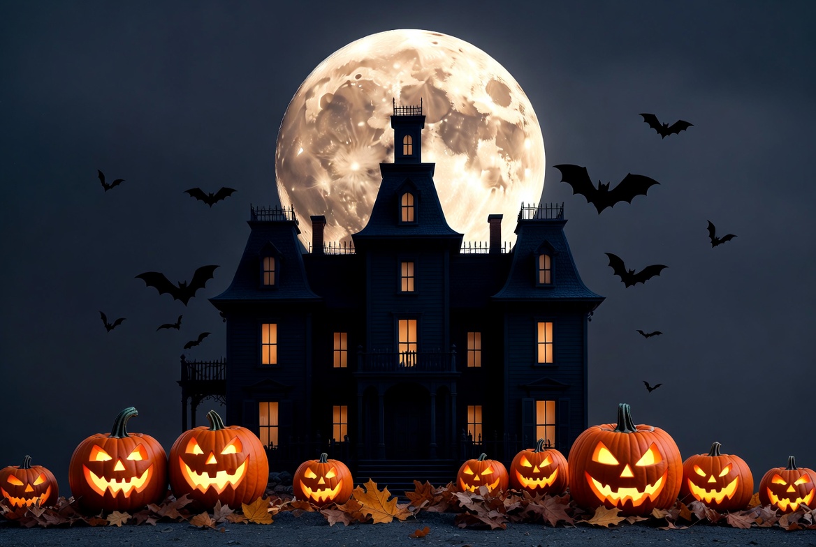 A dark gothic haunted mansion stands under a large full moon at night. Jack-o-lantern pumpkins with carved faces line the front, surrounded by fallen autumn leaves. Bats fly in the sky against a starry background.