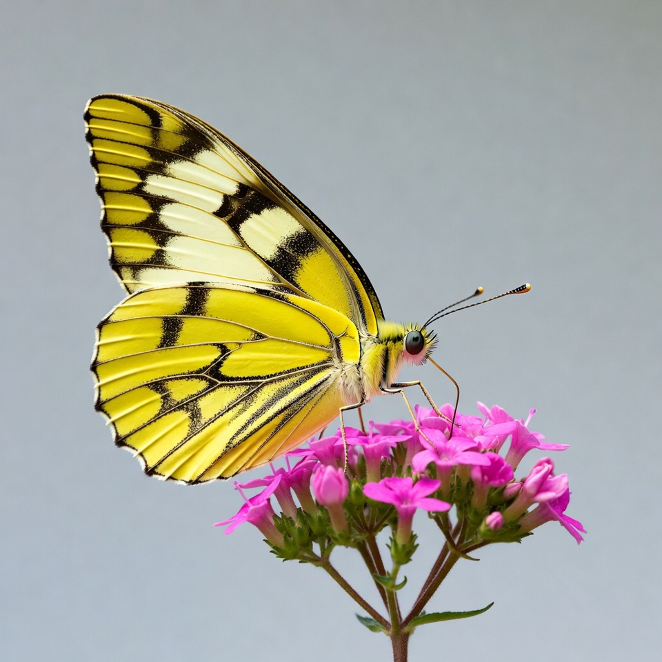 A vibrant yellow butterfly with black and white wing patterns perches on a cluster of pink flowers. The butterfly's wings are spread open, showcasing intricate markings, while its legs grip the delicate pink blooms. The image features a plain gray background, isolating the subject.