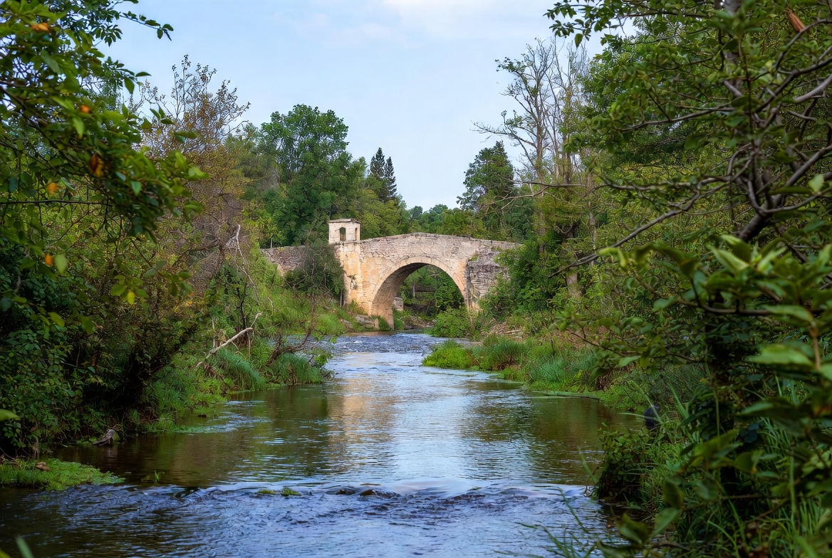 A historic stone arch bridge with a small tower spans a flowing river surrounded by dense green trees and foliage. The bridge features light beige stone construction and a single prominent arch. Clear blue sky reflects in the calm waters below.