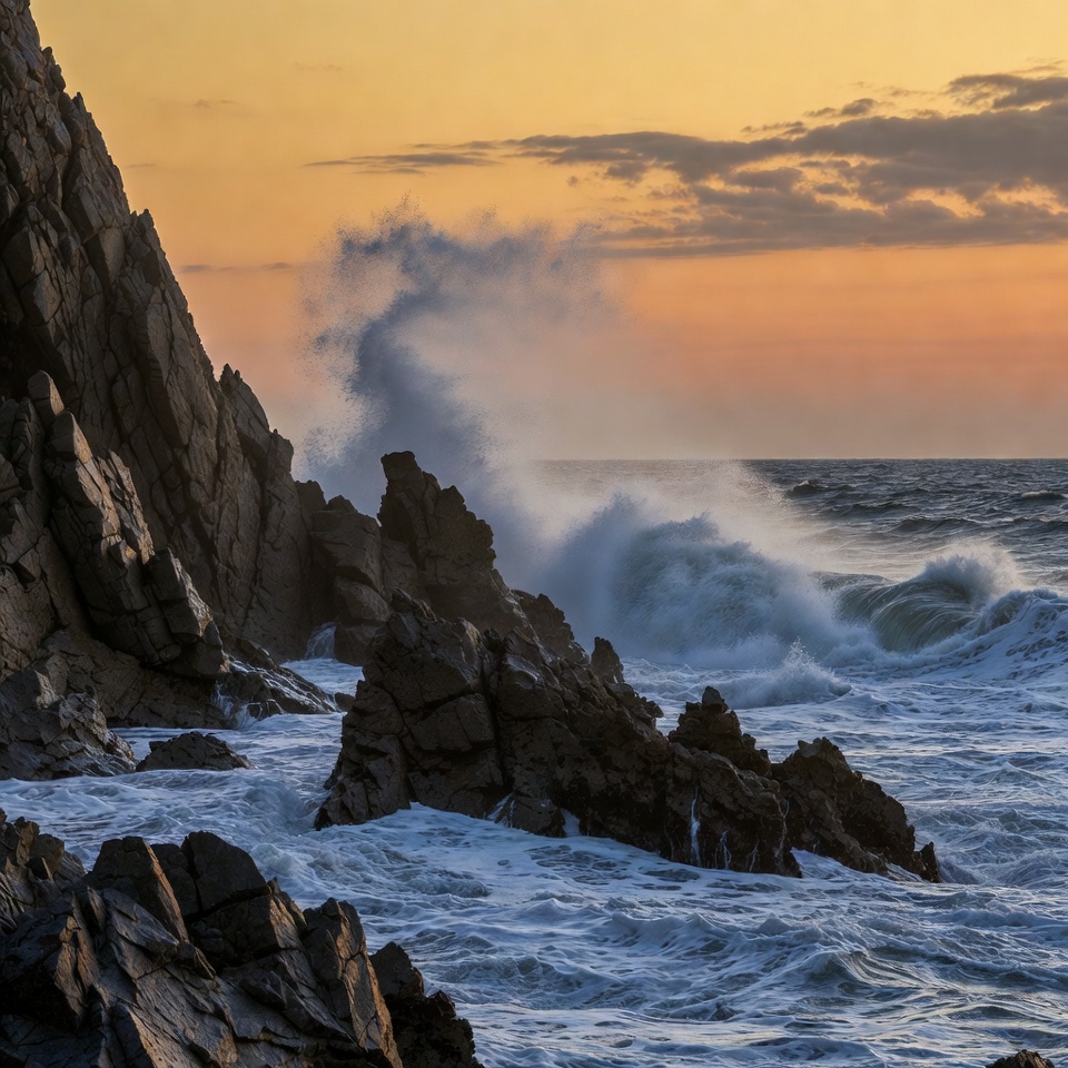 Powerful ocean waves crash against rugged rocky cliffs during a vibrant sunset. The sky glows with orange and yellow hues above the turbulent sea. White foam sprays high from the waves breaking on the dark, jagged rocks.
