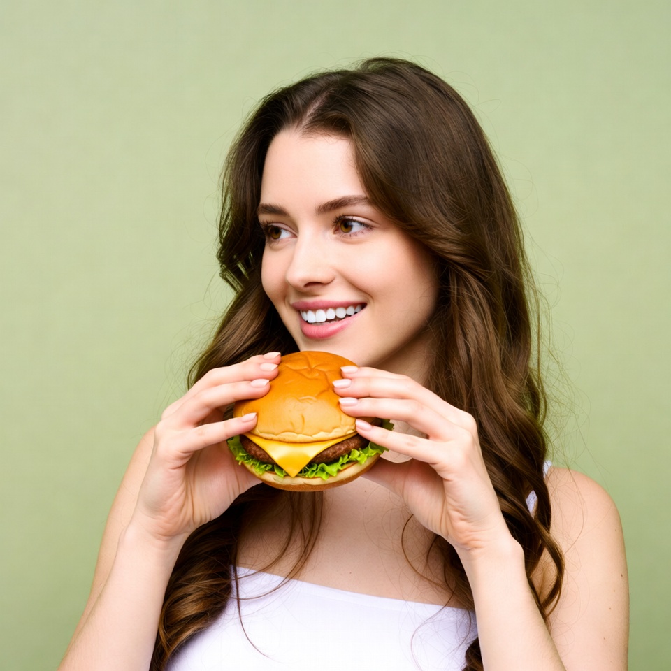 A young woman with long brown hair smiles while holding a cheeseburger with both hands. She wears a white top and stands against a green background. The burger features a sesame seed bun, melted cheese, and lettuce.