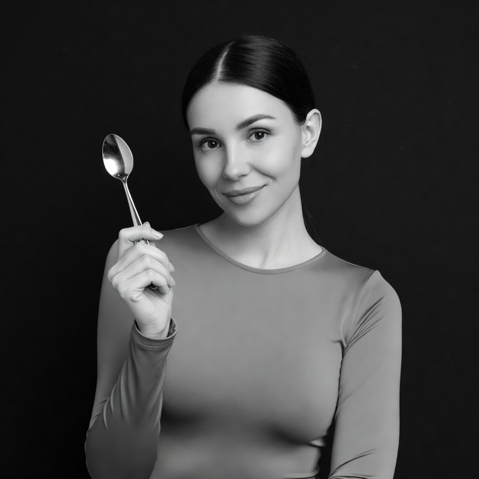 A young woman with dark hair in a ponytail smiles while holding a metal spoon in her right hand. She wears a long-sleeved gray top and poses against a solid black background. The image is in black and white.