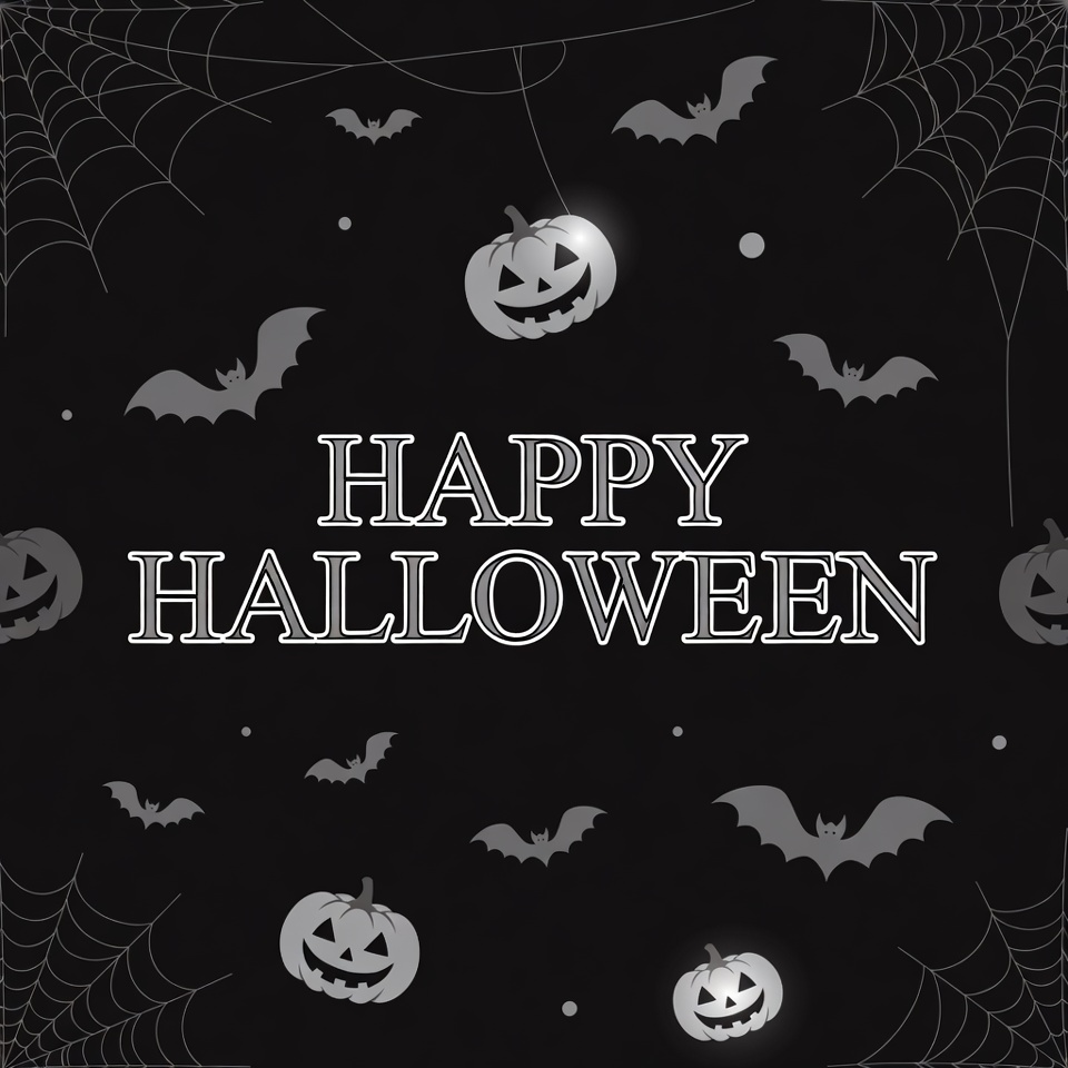A black background features white spider webs, flying bats, and glowing jack-o'-lantern pumpkins. Bold white text reads 'HAPPY HALLOWEEN' in the center. The design is a festive Halloween illustration with scattered Halloween elements.