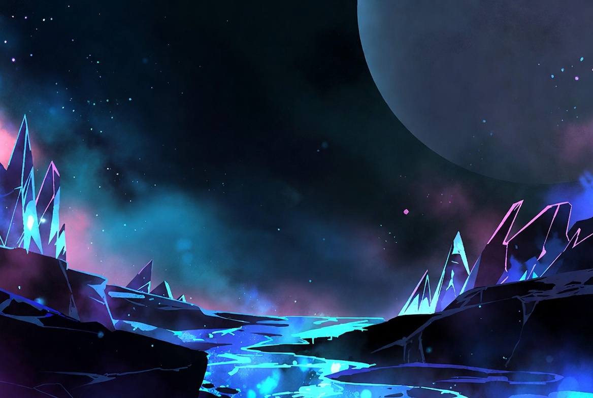 A vibrant digital illustration depicts jagged crystal mountains glowing in neon pink, blue, and purple hues under a starry night sky. A glowing blue river flows through dark rocky terrain in the foreground. A large purple planet looms prominently on the horizon amid cosmic nebulae.