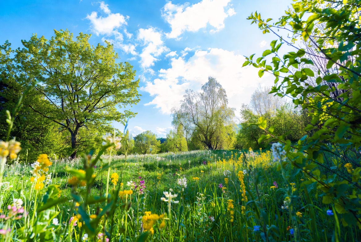 blooming, blue sky, bushes, clouds, field, flora, flowers, green grass, green trees, greenery, landscape, lush, meadow, natural, nature, outdoor, pink flowers, sky, spring, sunlight, trees, vibrant, white clouds, white flowers, yellow flowers, wildflowers