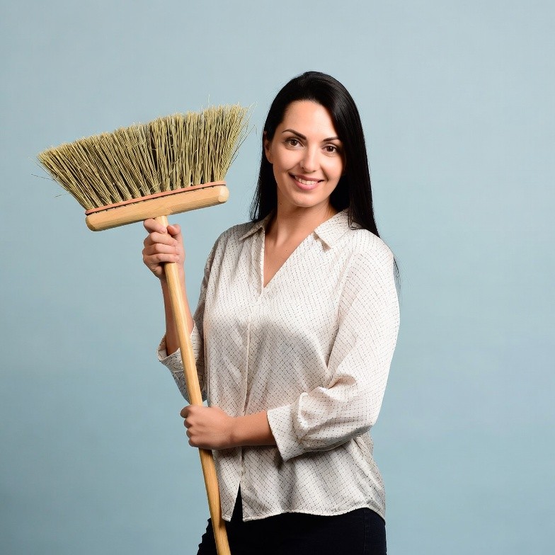 A smiling woman with long dark hair holds a large wooden broom in her hands against a solid blue background. She wears a light-colored button-up blouse and black pants. The broom has natural straw bristles and a red handle trim.
