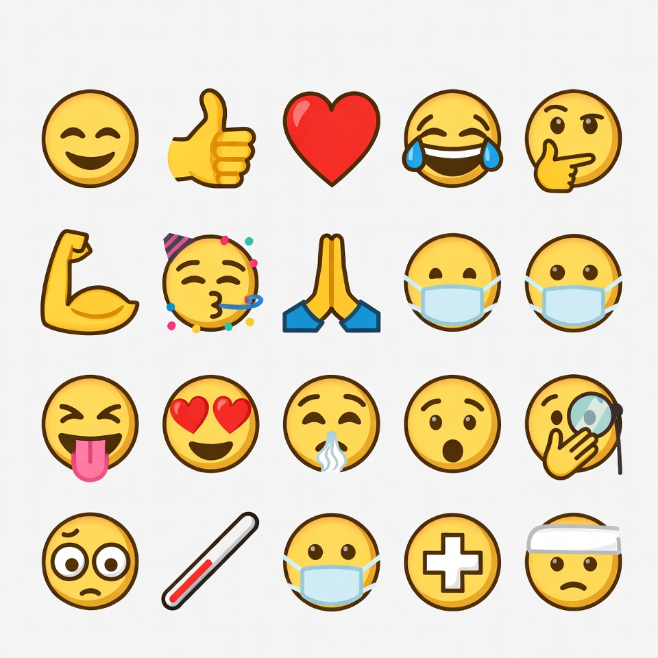 A collection of various yellow emoji icons arranged in a grid on a white background. The set includes smiling faces, hand gestures like thumbs up and flexed bicep, hearts, party elements, medical masks, thermometer, and medical cross. Emojis depict emotions such as laughing, winking, kissing, and surprised expressions.