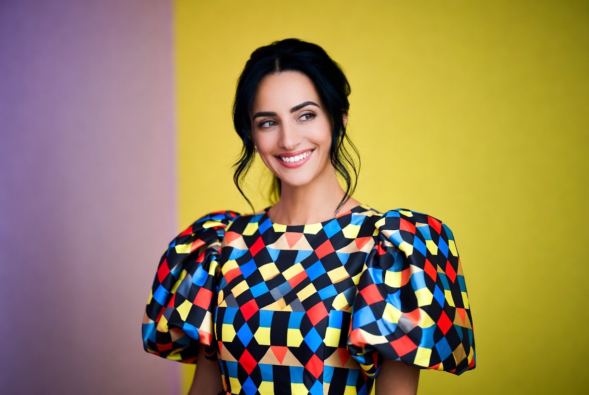 A woman with long dark hair styled in an updo smiles warmly at the camera. She wears a vibrant multicolored dress with geometric patterns and prominent puffed sleeves. She stands against a colorful background featuring purple and yellow panels.