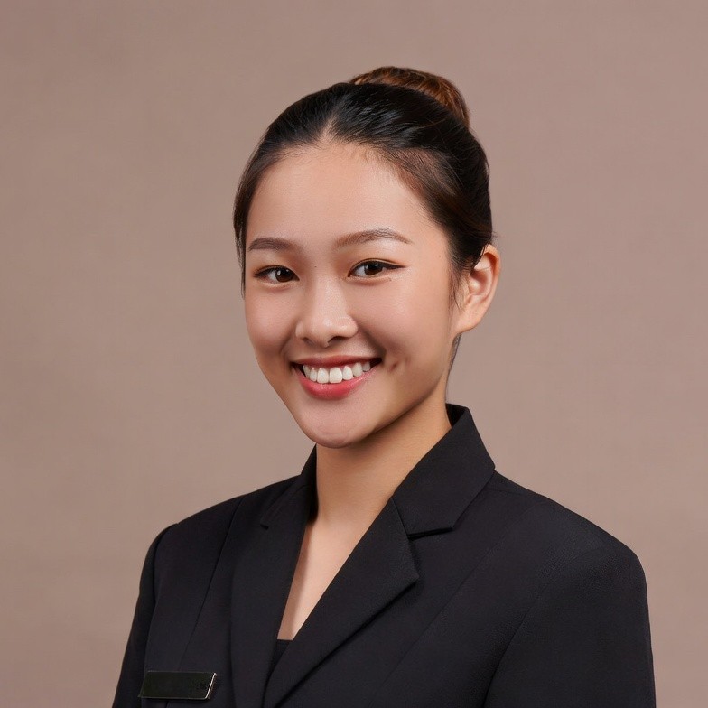 A young Asian woman with dark hair in a neat bun smiles warmly at the camera. She wears a professional black suit jacket with a name tag pinned to it. The image features a plain beige background.