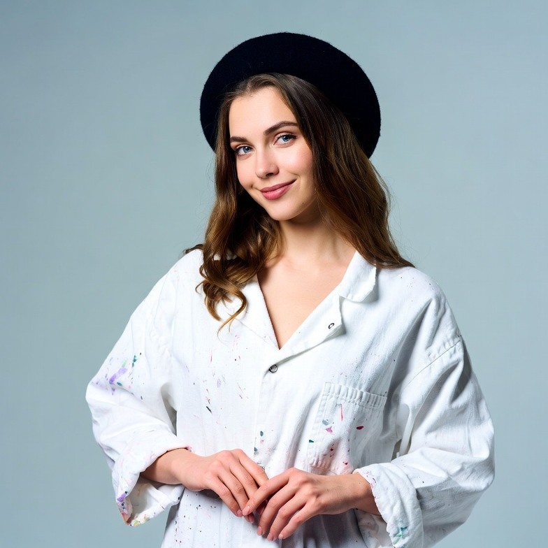 White, beret hat, black beret, brown hair, colorful paint, female, hands clasped, light blue background, paint splatters, portrait, smiling, wavy hair, white shirt, young woman, woman