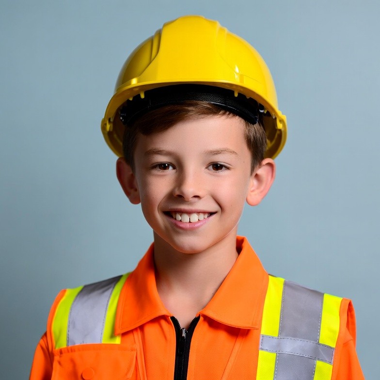 A young boy with short brown hair smiles at the camera while wearing a yellow hard hat and an orange high-visibility vest with reflective strips. He stands against a plain light blue background. The vest has a front zipper and the hard hat sits securely on his head.