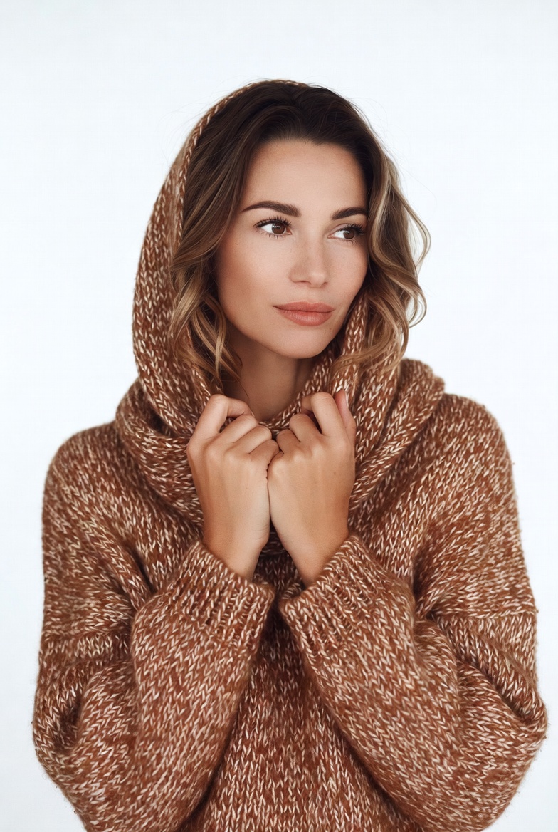 A woman with wavy brown hair wears a chunky brown hooded sweater with the hood up. She gazes thoughtfully to the side while holding the edges of the hood near her face. The image is set against a plain white background.