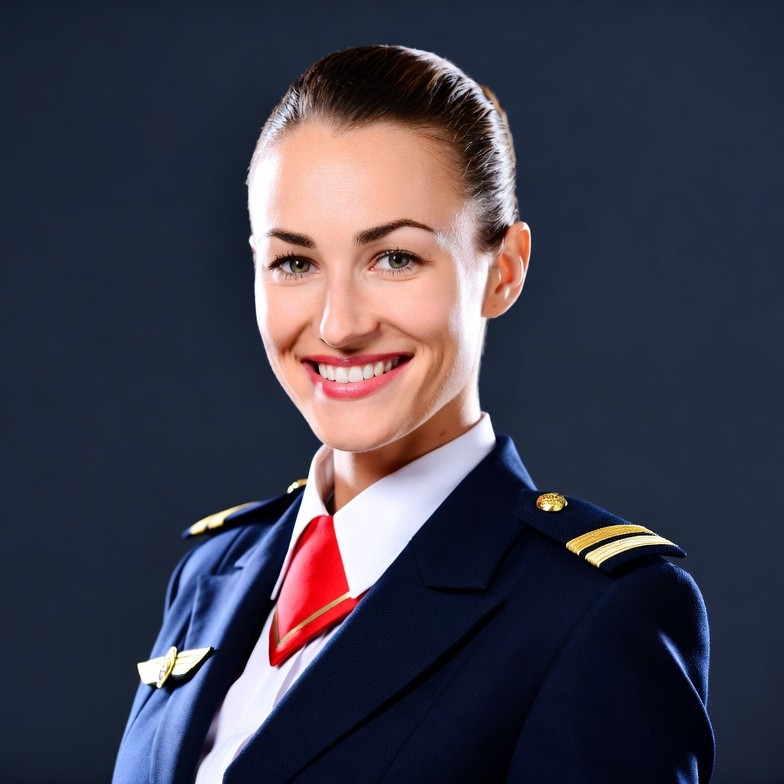 A young woman with brown hair in a neat bun smiles confidently at the camera. She wears a navy blue pilot uniform with gold epaulets, a red tie, white shirt, and wings insignia. She stands against a dark gray background.