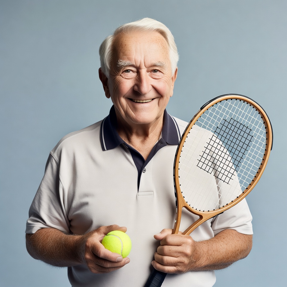 Elderly man holding tennis racket and ball