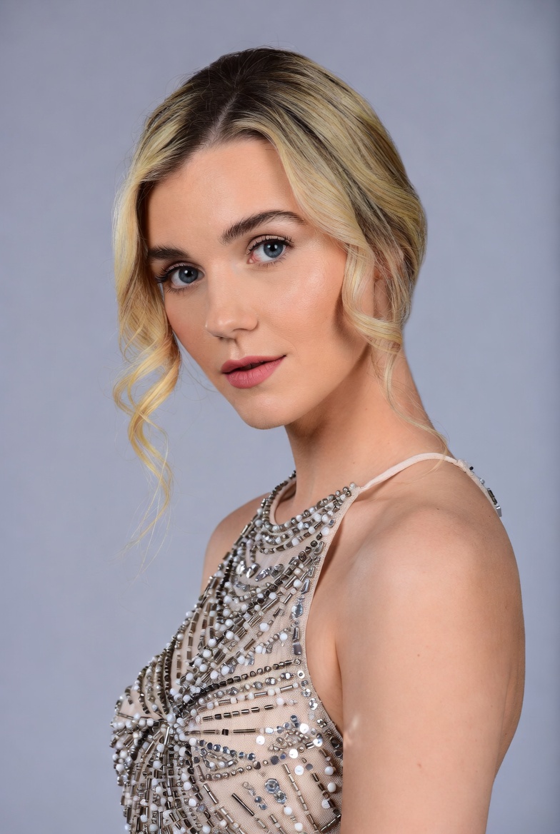 A young White woman with long blonde hair styled in loose curls looks over her shoulder. She wears a sparkling beaded halter neck dress with intricate silver designs. She poses against a plain gray background.
