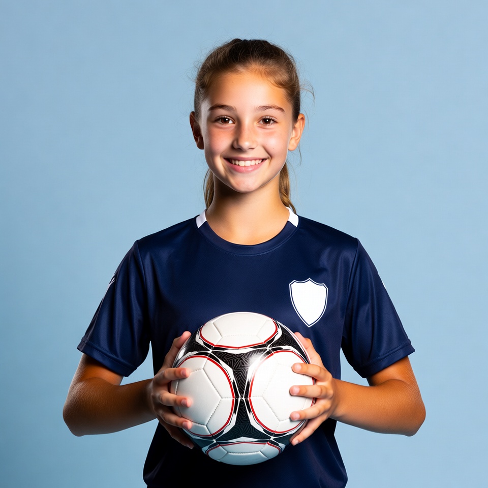 A young girl with a ponytail smiles while holding a white soccer ball in front of her navy blue soccer jersey. She wears a jersey with white accents and a shield emblem on the chest. The image is set against a solid light blue background.