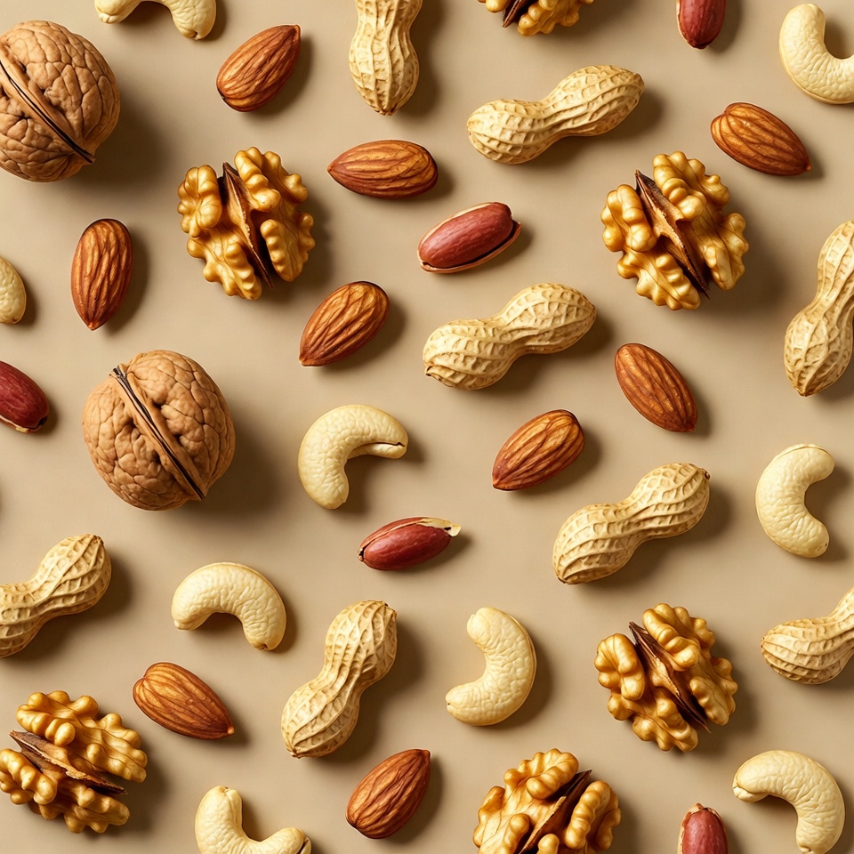 Mixed Nuts Scattered on Beige Background