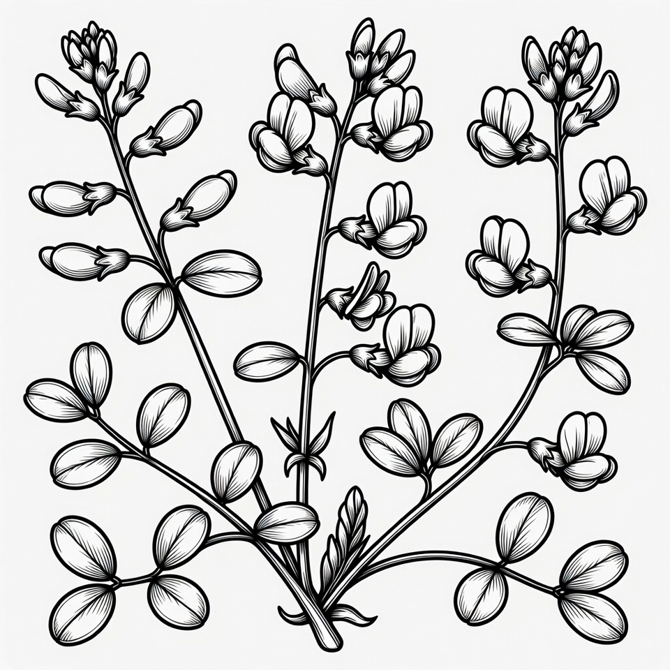 black and white, blooms, botanical, clipart, drawing, flora, flowers, illustration, isolated background, leaves, line art, lupine plant, lupinus, perennial, plant, pods, stems, vector, wildflower, lupine