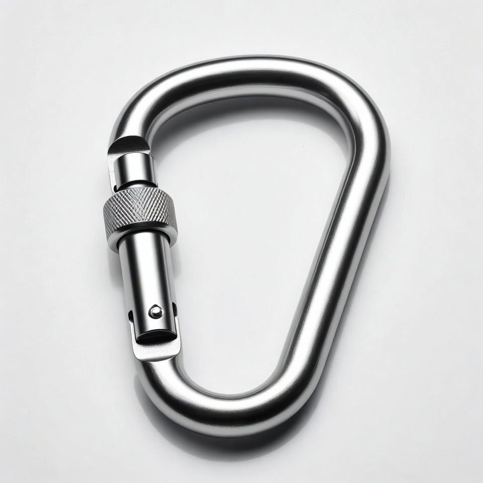 D-ring, climbing carabiner, climbing gear, clip, closeup, gear clip, hardware, isolated, knurled screw, locking carabiner, metal carabiner, mountaineering, outdoor equipment, polished steel, safety clip, screw gate, shiny metal, silver carabiner, white background, carabiner