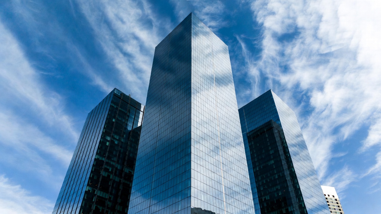 architecture, blue sky, blue-tinted glass, cityscape, clear sky, clouds, downtown buildings, glass buildings, high-rise, modern architecture, reflective glass, tall buildings, towering structures, urban skyline, skyscrapers