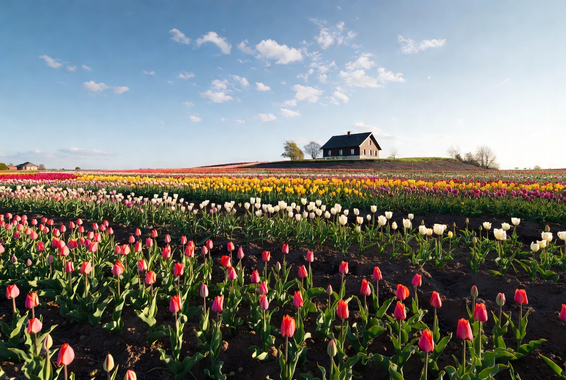 Dutch tulips, black house, blooming tulips, blue sky, clouds, colorful flowers, field house, floral field, flower farm, flower rows, hill, landscape, nature, outdoors, pink tulips, red tulips, spring flowers, tulip farm, tulips, white tulips, wooden house, yellow tulips, tulip fields