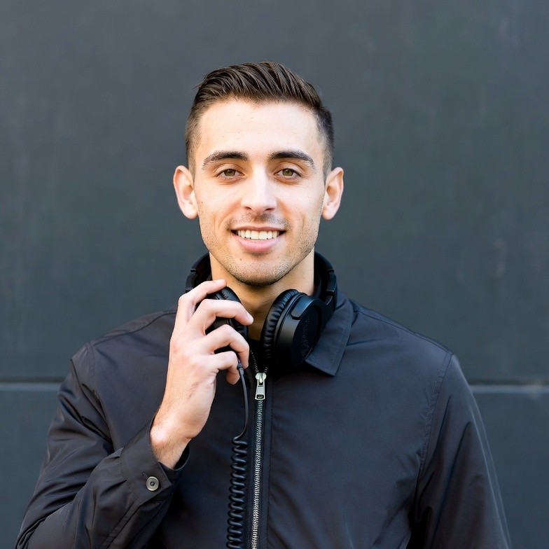 A young man with short dark hair and a smiling expression stands against a dark gray background. He wears a black jacket and holds black over-ear headphones around his neck with his right hand. His eyes are light-colored and he faces the camera directly.