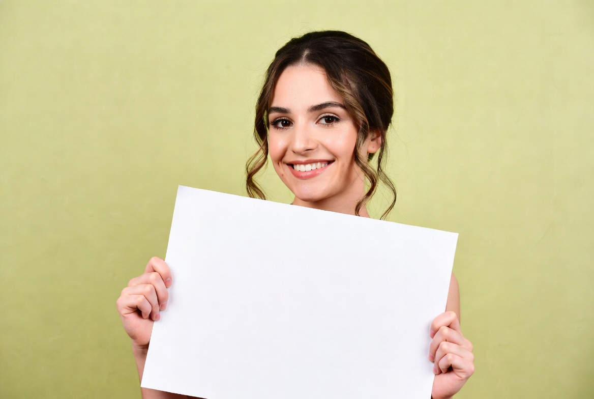 A young woman with wavy dark hair in an updo smiles happily while holding a large white blank sign in front of her. She stands against a light green background. Her eyes are bright and she grips the sign with both hands.