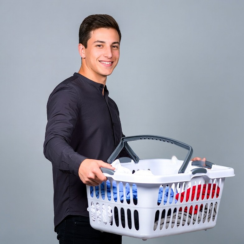 A young man with short dark hair smiles while holding a white laundry basket overflowing with white, blue, and red clothes. He wears a black long-sleeved shirt and stands against a plain gray background. His expression is cheerful and relaxed.