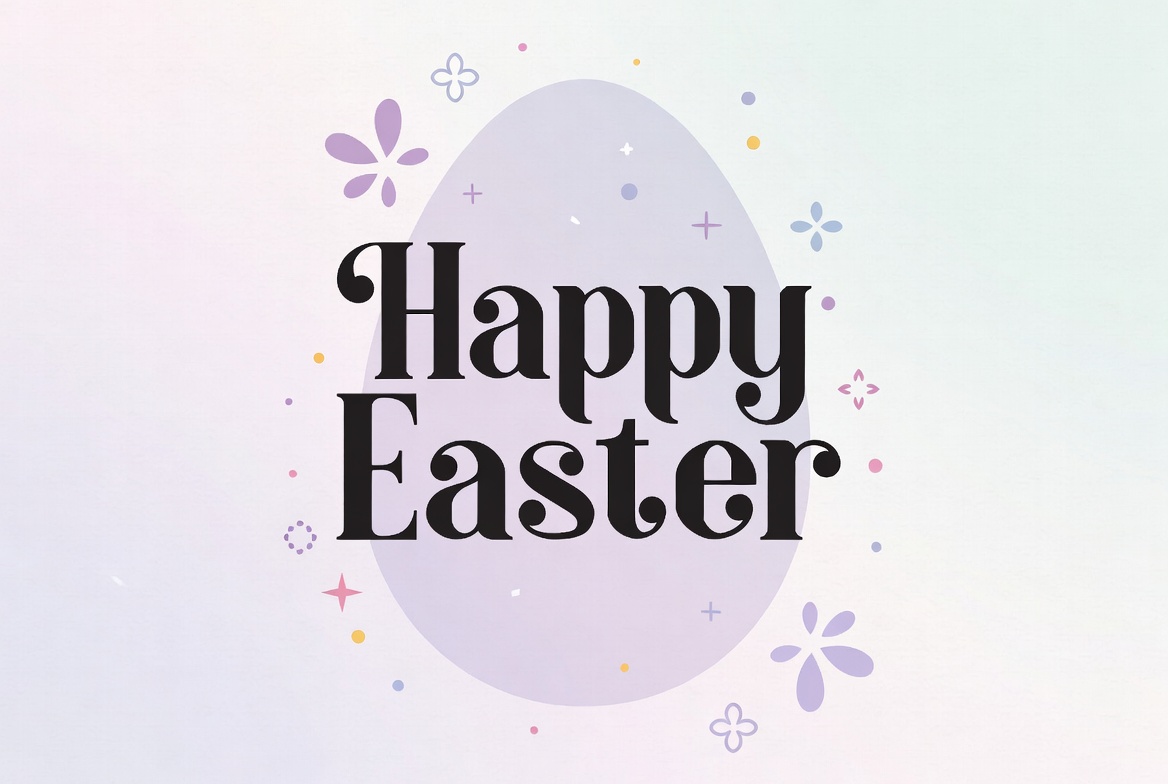 A colorful illustration features the text 'Happy Easter' in bold, playful font. A large purple egg outline surrounds the text, decorated with purple flowers, stars, and sparkles on a pastel gradient background.