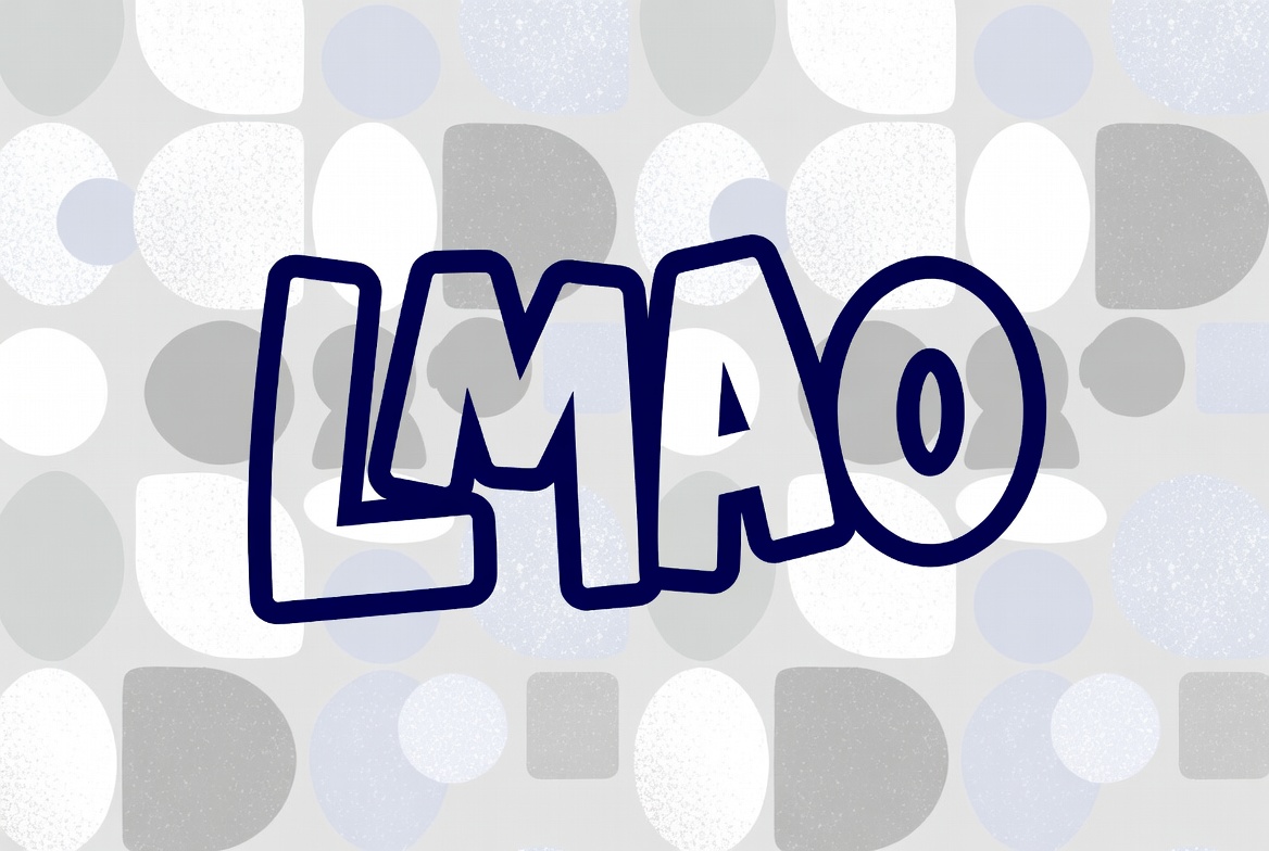 abstract pattern, blue outline, bold font, clipart, digital art, funny graphic, graphic, gray circles, illustration, isolated background, laughing, meme text, polka dot background, text, white dots, LMAO