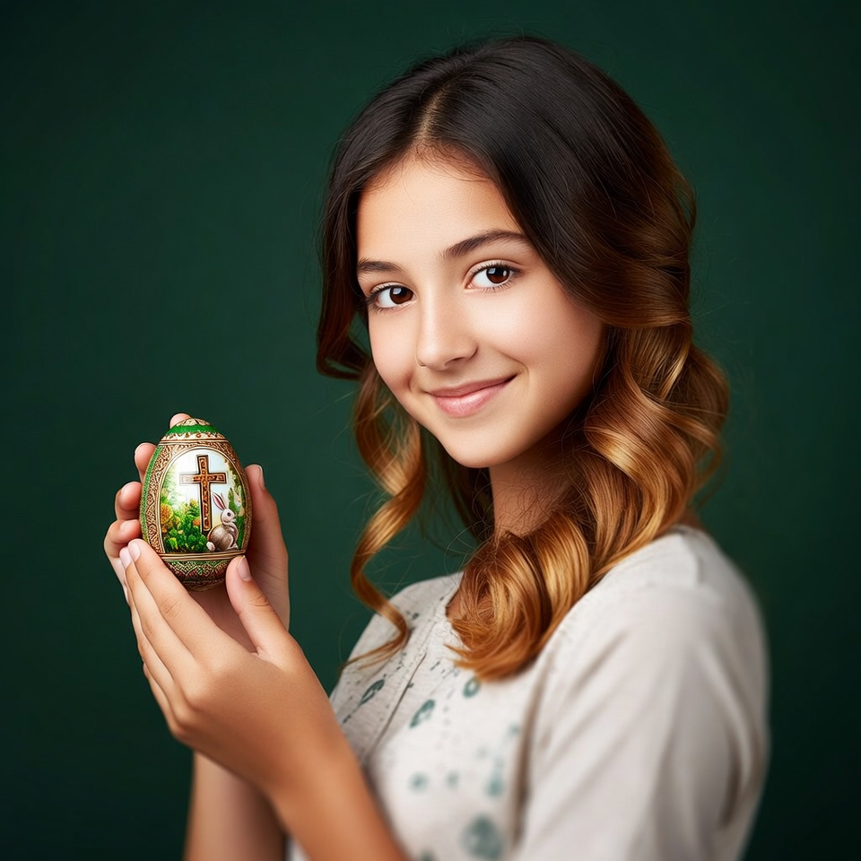 A young girl with long wavy brown hair smiles while holding a small intricately decorated Easter egg with a cross and green landscape design. She wears a light-colored top and stands against a solid green background. Her hands gently cradle the colorful egg in front of her.