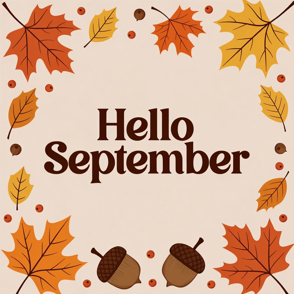 A clipart illustration features bold text 'Hello September' centered in a frame of orange and yellow autumn leaves and acorns. Red berries and additional leaves decorate the beige background. The design evokes fall themes with vibrant foliage elements.