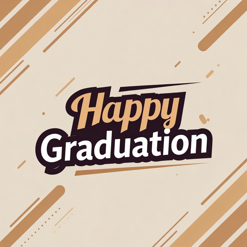 A vibrant illustration features the text 'Happy Graduation' in bold, playful brown and white fonts. It is set against a beige background with diagonal tan stripes and geometric accents. The design has a festive, celebratory style with dynamic lines.