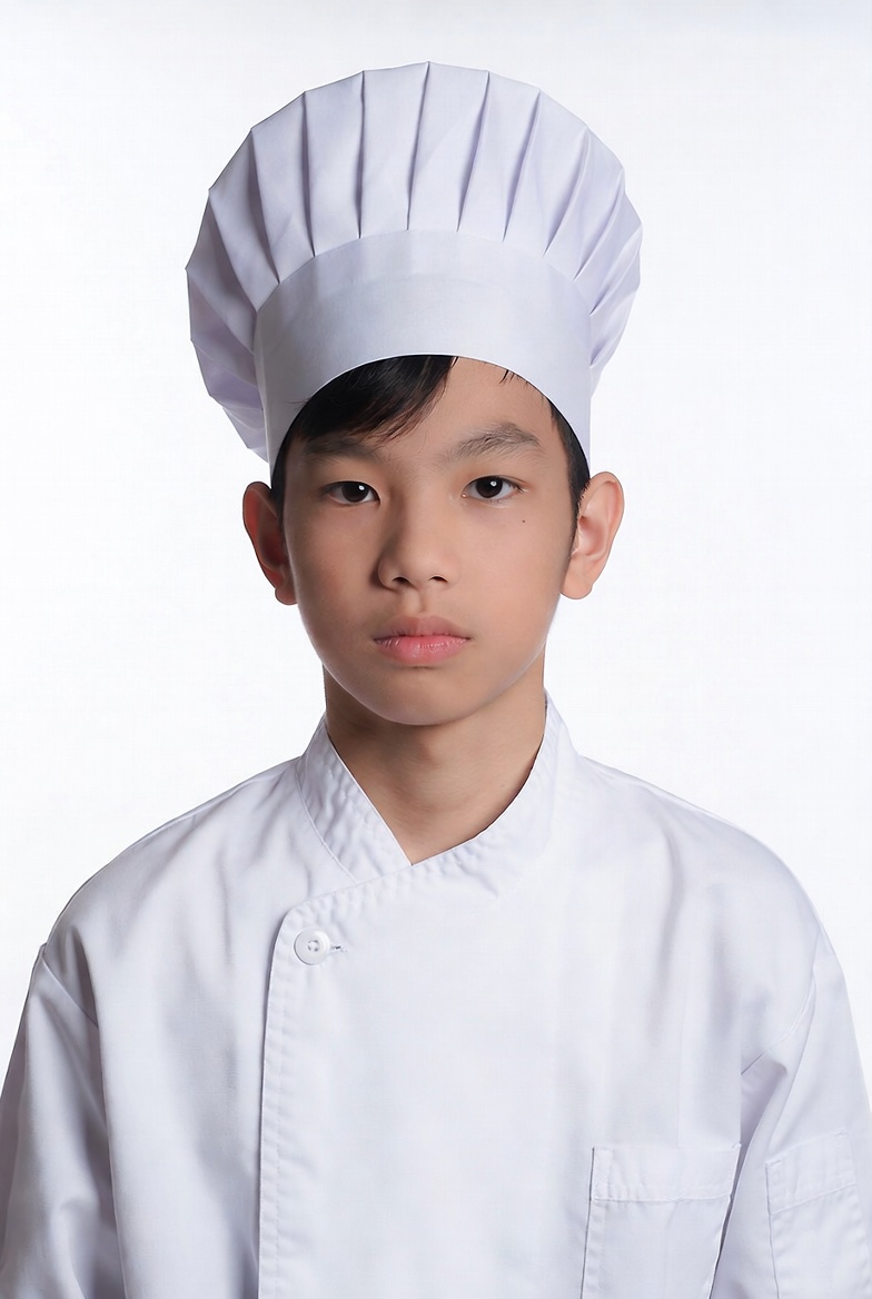 Asian, Asian boy, black hair, chef, chef hat, chef uniform, child, cooking, kitchen, male, neutral expression, portrait, short hair, studio photo, toque, white background, white uniform, young boy, boy