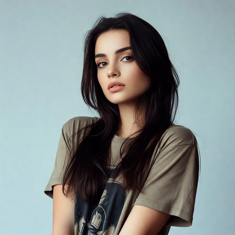 A young woman with long straight black hair gazes at the camera against a light blue background. She wears a loose-fitting olive green t-shirt and has subtle makeup with defined eyes and lips. Her expression is calm and direct.