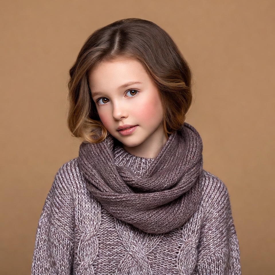 A young girl with shoulder-length wavy brown hair stands against a beige background. She wears a light brown cable-knit sweater and a matching chunky scarf wrapped around her neck. Her face shows a gentle expression with subtle blush on her cheeks.